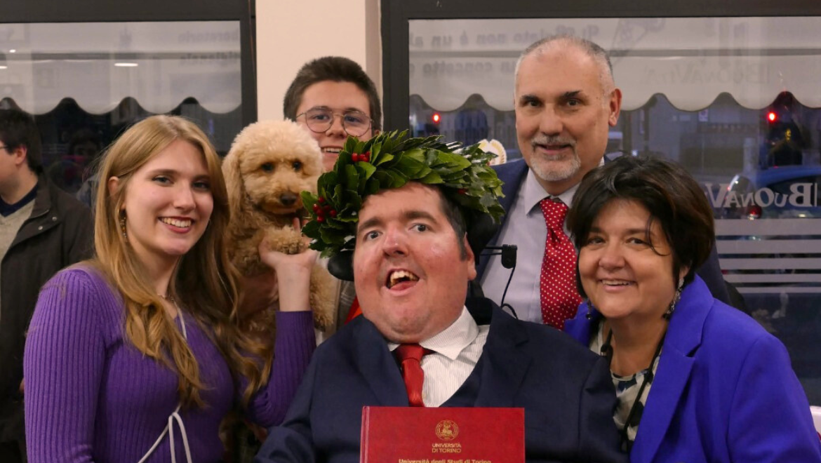 «Sono Alessandro Rosa, un ragazzo di 26 anni disabile motorio con la SMA. Mi sono laureato a novembre 2025 nel corso magistrale in Economia Aziendale, specializzazione Direzione d’Impresa, Marketing e Strategia, all’Università degli studi di Torino. Vivo a Torino con la mia famiglia: mia mamma, mio papà, mia sorella, mio fratello e una cagnolina.